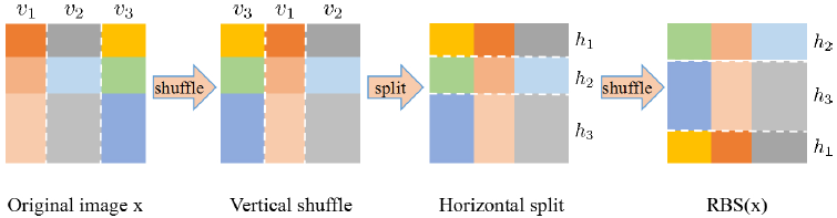 - 提出了Random Block Shuffle (RBS):一种简单明了的图像转换方法,将目标图像随机地分成k块,并随机地对这些块进行分离混合操作。该方法在某种程度上破坏了图像的全局结构特征并保留了图像的局部特征。