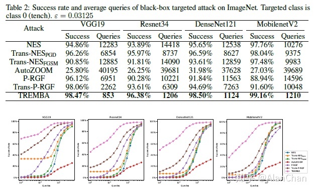 - TREMBA方法与其他方法相比,在相同查询次数的基础上,在不同网络的攻击效果上都呈现出很好的攻击成功率。(粉红色线)