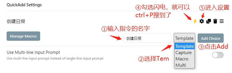 进入QuickAdd插件的设置页面,进行以下设置。